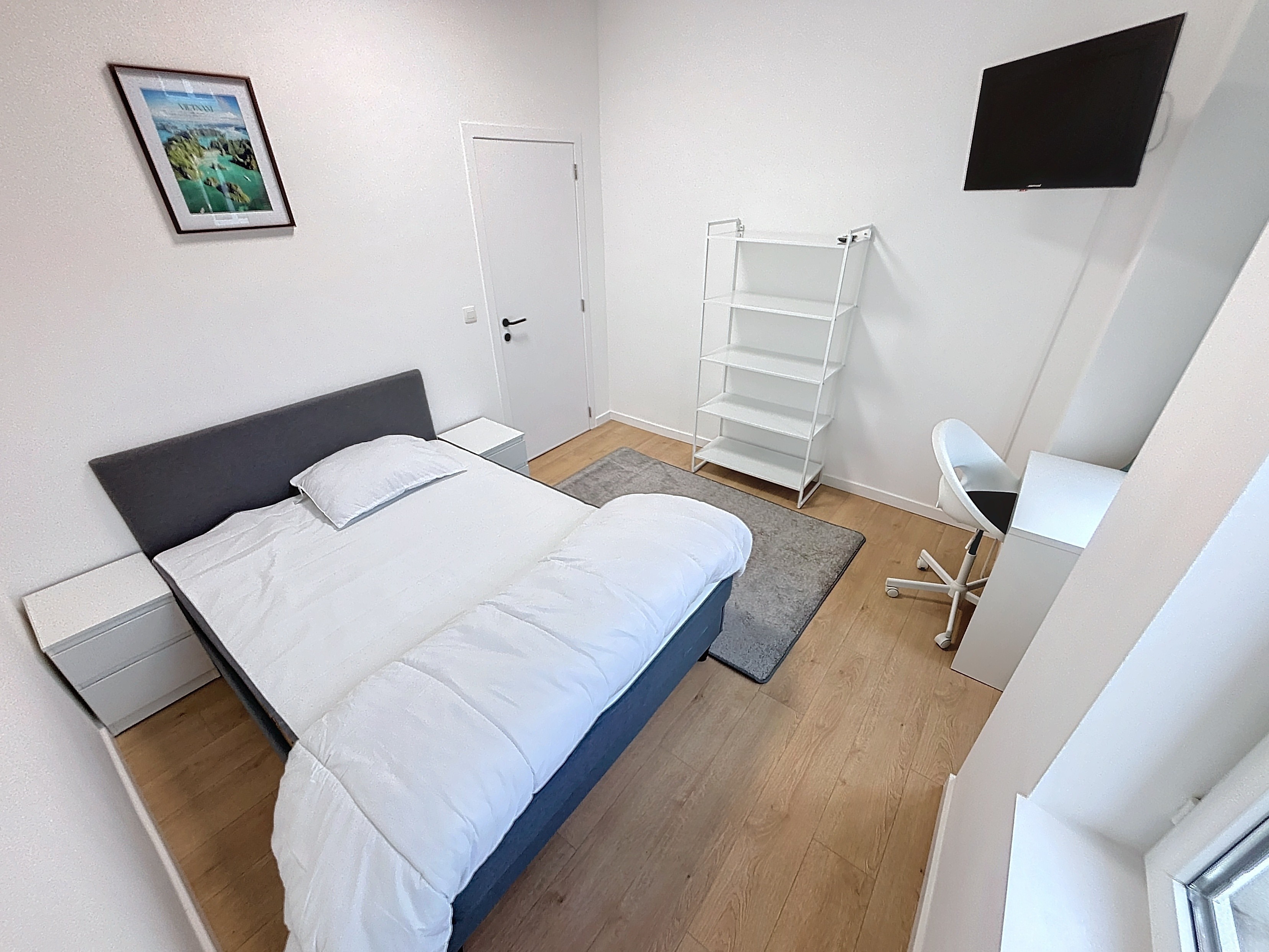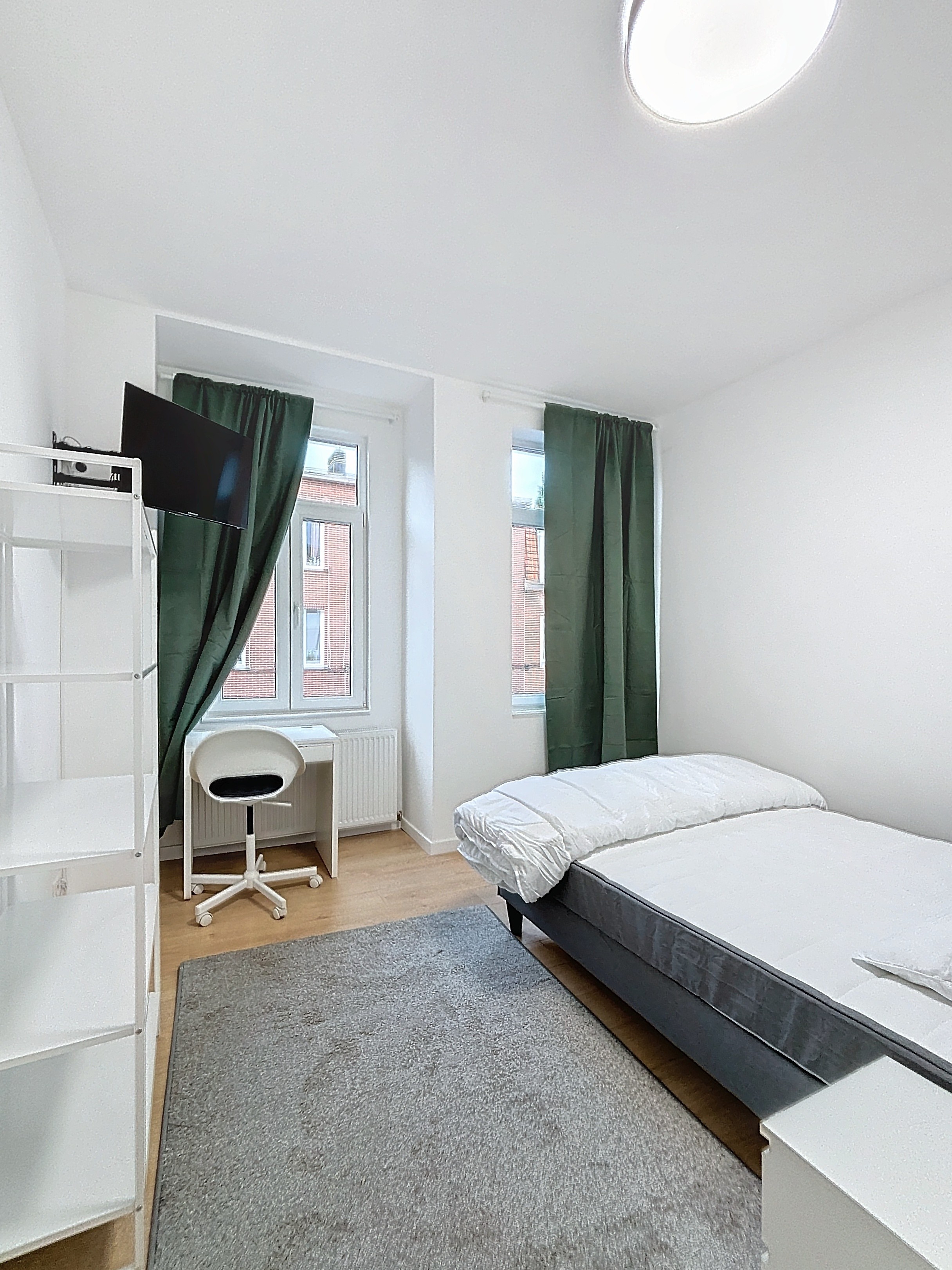 La chambre est meublée avec soin (lit double, bureau, armoire), lumineuse et prête à vous accueillir.