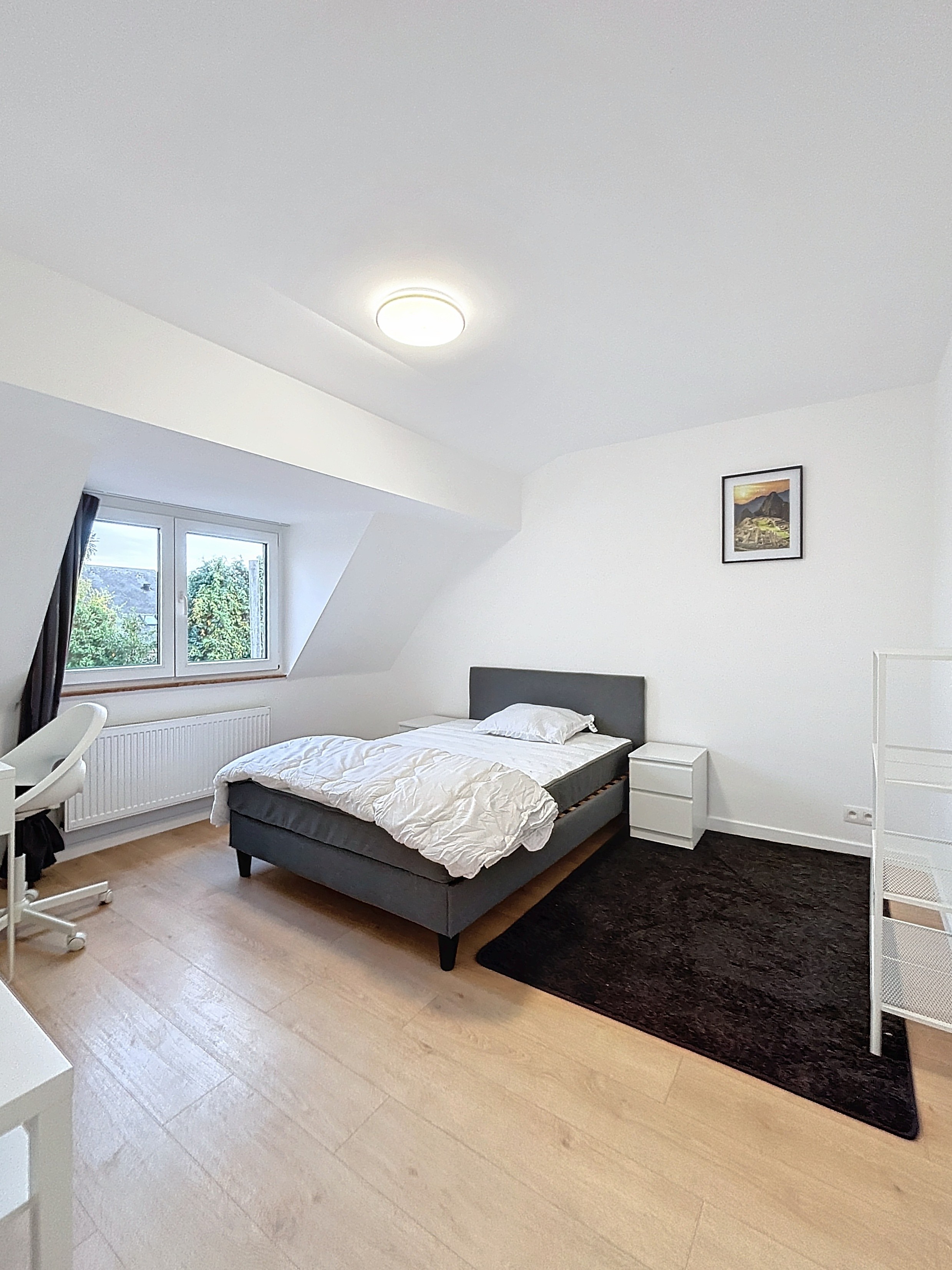 La chambre est meublée avec soin (lit double, bureau, armoire), lumineuse et prête à vous accueillir.